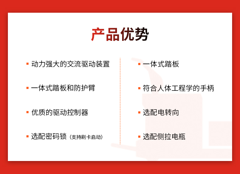産品賣(mài)點 動力強大(da)的交流驅動(dòng)裝置 一體式(shi)踏闆和防護(hù)💞臂📱 驅動控制(zhì)器 選配密碼(ma)鎖 一體式踏(ta)闆 符合人體(ti)工程學⁉️的手(shou)柄 選配電轉(zhuan)向 選配側拉(lā)電瓶