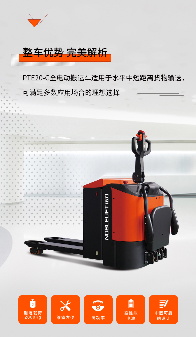 全電動(dong)搬運車(che) 産品賣(mài)點 額定(dìng)載荷2000kg 維(wéi)修方便(bian) 高功率(lǜ) 高性能(neng)電池 牢(lao)固的設(shè)計